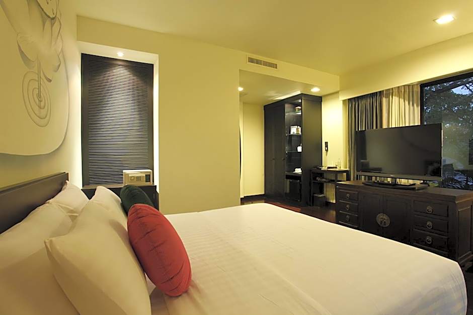 Deluxe Garden View is 377 square feet and includes a queen-size bed 150-154 width.